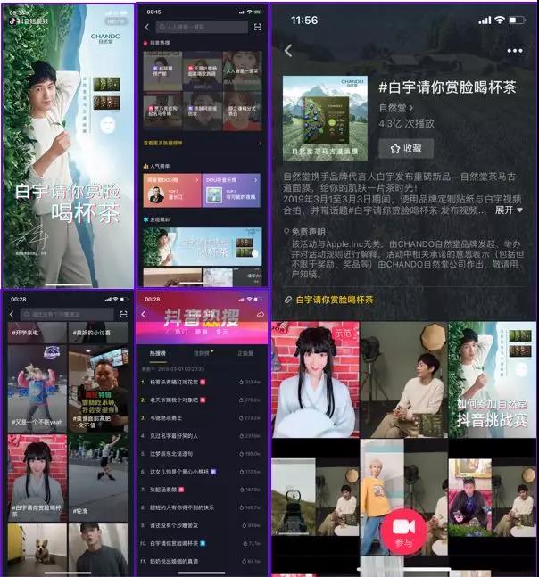 自然堂攜手代言人白宇,推出全新的茶馬古道面膜。在3月7日自然堂天貓旗艦店首發前,3月1日先在抖音上發起挑戰賽#白宇請你賞臉喝杯茶#。自然堂抖音官方賬號發布一條白宇拍攝的母視頻,引導用戶合拍,并邀請抖音頭部達人拍攝示范視頻,上線3天內挑戰賽話題的視頻播放量突破5億;截至3月10日,視頻播放量達到6.3億。
